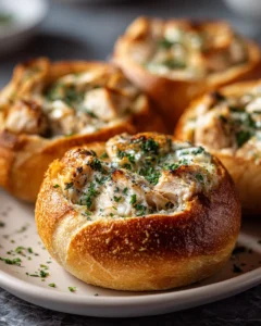 Parts of this recipe can be prepared ahead to save time. The chicken Alfredo filling can be made up to one day in advance and stored in an airtight container in the refrigerator. The bread bowls can also be hollowed out ahead of time. When ready to serve, reheat the filling gently on the stovetop, assemble the bread bowls, and bake just before serving. This approach ensures the bread stays crisp and the filling remains creamy.