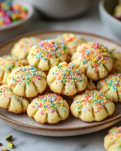 Adding pistachios to spritz cookies isn’t just for flavor—it brings a delightful crunch that contrasts beautifully with the soft, buttery dough. Pistachios are naturally rich in healthy fats and protein, making this treat a slightly more nourishing indulgence. Meanwhile, the colorful sprinkles create an instant sense of celebration, making these cookies ideal for birthdays, festive holidays, or simply brightening a weekday afternoon.