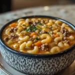 A rich and comforting soup that combines savory ground beef, tender elbow macaroni, and melted cheese in a creamy broth for the ultimate weeknight family dinner.