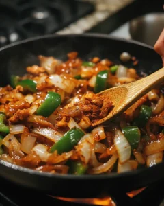 In the same pan, add the diced onion and green bell pepper. Cook for 4–5 minutes until softened. Stir in the minced garlic and cook for 30 seconds until fragrant.
