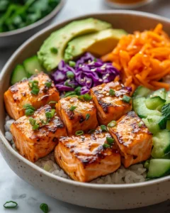 Absolutely. These bowls are excellent for meal prep and can be stored in airtight containers in the refrigerator for up to three days. For best results, store the salmon, rice, vegetables, and sauce separately. Reheat the salmon and rice gently, then assemble the bowl with fresh vegetables and sauce just before eating. This keeps everything tasting fresh and prevents the vegetables from becoming soggy.