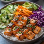 A vibrant, satisfying bowl featuring crispy salmon bites, fluffy rice, fresh vegetables, and a creamy sweet-spicy sauce that comes together quickly for an irresistible meal.