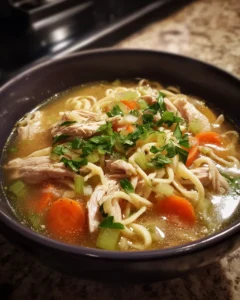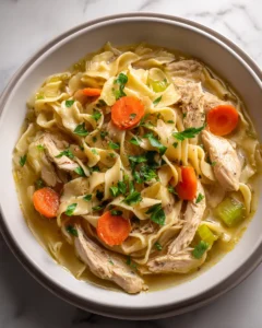 These memories are woven into this recipe. The first spoonful, with its blend of aromatic broth and tender chicken, brings back that sense of calm and warmth. It recalls evenings spent gathered around the table, wrapped in blankets, enjoying a bowl of soup that made everything feel just a little more peaceful. The noodles add softness and familiarity, the vegetables bring natural sweetness, and the broth ties everything together in a way that feels deeply soothing.