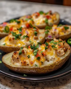 A cozy, flavorful twist on the classic twice-baked potato, filled with tender chicken, zesty southwest spices, colorful bell peppers, and melted Pepper Jack cheese. Perfect for weeknight dinners, family gatherings, or a comforting meal any time of year.