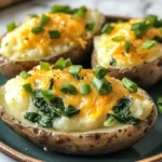This hearty twice-baked potato dish takes a classic comfort food and elevates it with fluffy cheddar and fresh spinach, creating a creamy, savory side that’s perfect for family dinners, cozy evenings, or festive gatherings. Each bite is warm, cheesy, and full of flavor, making it a dish that both adults and kids will love. Inspired by the joy of family meals and the tradition of sharing comfort food, this recipe transforms simple potatoes into a centerpiece that’s as visually appealing as it is delicious.