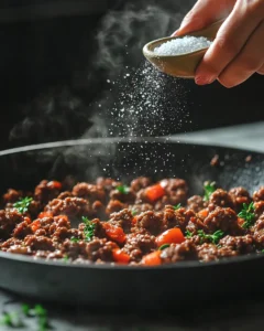 Season the beef mixture with 1 teaspoon salt, 1/2 teaspoon black pepper, 1 teaspoon paprika, and 1/2 teaspoon dried thyme. Stir thoroughly so the seasoning coats every bite of beef, creating a well-rounded, savory base.
