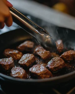 Choose well-marbled beef such as sirloin tips or tenderloin tips. Marbling ensures tenderness and flavor when seared at high heat.