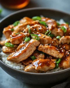 Tender chicken coated in a glossy, sticky sauce served over fluffy rice for a comforting, crave-worthy meal.