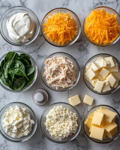 These ingredients build that “loaded” taste: savory, creamy, and cheesy with a gentle garlic-onion backbone. For best results, bring the cream cheese to room temperature so it blends smoothly.- Cooked chicken: 4 cups (about 1 1/2 lb / 680 g), shredded or chopped
