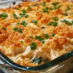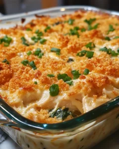 A creamy, comforting casserole made with tender chicken, spinach, and a rich cream cheese sauce, topped with melty cheese and a buttery crunchy finish—perfect for a cozy family dinner or easy meal prep.