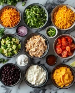 Optional toppings: diced tomatoes 1 cup (180 g), sliced jalapeños 1/4 cup (30 g), sliced green onions 1/2 cup (50 g), chopped cilantro 1/2 cup (20 g), diced avocado 1–2