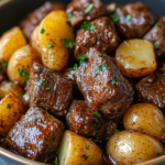 A comforting slow cooker meal featuring tender beef bites and buttery potatoes simmered with garlic and herbs until perfectly flavorful.
