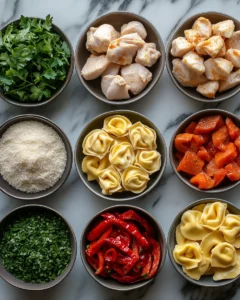 Return chicken and add fire roasted red peppers. Stir in tortellini and simmer 2–3 minutes until heated through.