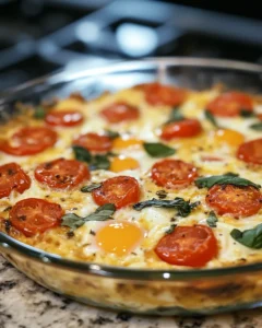 This egg bake isn’t just a simple breakfast—it’s a versatile, wholesome dish that works for any occasion. The combination of fresh tomatoes and aromatic basil delivers bright, satisfying flavors, while the eggs and cheese provide protein and a creamy texture. It’s a one-dish meal that looks impressive yet is incredibly easy to make.