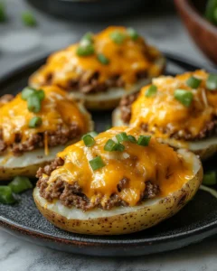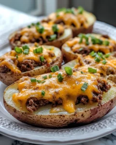 Yes! This recipe is perfect for make-ahead cooking. You can bake the potato shells, prepare the filling, and store it separately in the refrigerator for up to 24 hours before baking the stuffed potatoes. When ready to serve, fill the potato shells with the beef and cheese mixture and bake at 375°F (190°C) for 20–25 minutes, or until the tops are golden and the cheese is bubbling. This is especially useful for dinner parties or busy weeknights when you want a hearty meal ready in less time.
