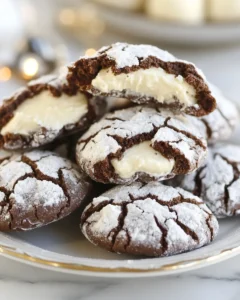 This recipe was inspired by classic holiday crinkle cookies — those nostalgic chocolate cookies everyone remembers from cookie swaps and Christmas tins — but with an irresistible twist. The cream cheese filling turns this nostalgic favorite into something truly unforgettable. These cookies not only look beautiful on dessert platters but also taste like a fusion between a brownie and a cheesecake, making them a show-stopping treat worth baking all year round.